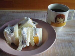 マーマンの食パンでフルーツサンド。黄金桃とブルーベリー。断面を気にせず作ったら、全然美味しそうに断面出なかったけど、めっちゃ美味しかった。