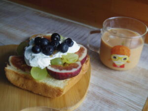 コストコのホテルブレッドで、フルーツマスカルポーネトースト。使ったフルーツはイチジク、マスカット、ブルーベリー。
