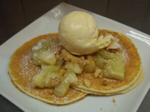 写真はパンケーキはアップルクランブルです。長野から届いたブラムリーを使ってます。酸味がしっかりあって、煮崩れやすい林檎で、なかなかスーパーや八百屋さんでは見かけない林檎なので、色んなお菓子でお店に出したいなーっと思っています。林檎は、これから紅玉、グラニースミス、サンフジと続きます。
