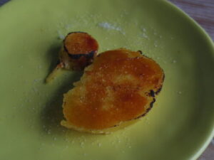 今までは、焼き芋クリームと角切りにしたさつま芋のグラッセを乗せてましたが、今年はキャラメリゼした焼き芋をトッピング。これは厚みをどうするかの試作で、私のオヤツになりました。