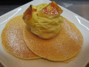 カウンター上のテイクアウト可能な焼き菓子は、洋梨とキャラメルのケーキです。今日は、イートインのご利用が少なくて、テイクアウトのご利用の多い一日。写真はパンケーキの焼き芋スペシャル。自家製バニラアイスの上に焼き芋クリームをモンブラン口金で絞って、キャラメリゼした焼き芋を乗せました。