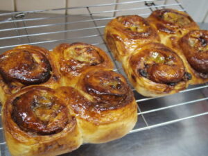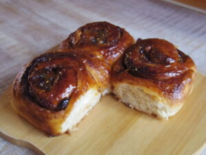 チェルシーバンズの具は、オレンジピールやカランツが定番かなと思うのですが、今日はブラムリーのコンポートとラムレーズン、黒糖とシナモンを巻きました。昨日のガレット生地とはまた別でむっちりふんわりパン生地がベースです。