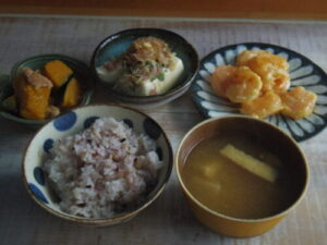 雑穀ご飯、エビのチリマヨ、かぼちゃそぼろ煮、薬味もりもり冷ややっこ、みそ汁。スイートチリソースとマヨネーズで、衣を付けて揚げたエビを絡めるというハイカロリーおかず。余ったポイントで買った冷凍エビで冷凍庫ミチミチなので、海老のおかずが多くなる予定。