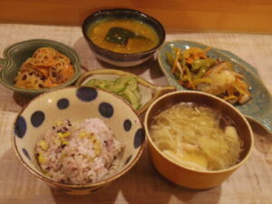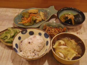 雑穀入りトウモロコシご飯、鯖の南蛮漬け、レンコンと人参のきんぴら、きゅうりの和え物、かぼちゃのそぼろ煮、みそ汁。