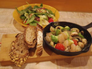 アヒージョ、サラダ、Bakery ukiのカンパーニュ2種の端っこたち。アヒージョの具は、海老、アボカド、マッシュルーム、プチトマト。