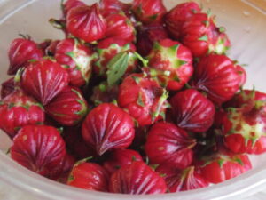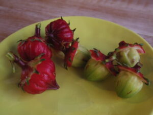 イートインのスコーンに選べるジャムは、いちじく、苺いよかん、ローゼルの3種から1つお選び頂けます。ローゼルはハイビスカスの種類で、私は今回初めて実物見ました。西京極の京ベジガーデンにしまごさんから頂きました。