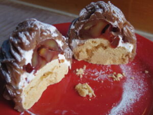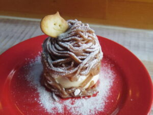 大きなメレンゲ、生クリーム、和栗の渋皮煮、更に生クリームと食感の良いクランブルを少し乗せて、和栗のクリームを絞りました。和栗のクリームは丹波栗と、愛媛の栗で作った渋皮煮のシロップのみで作ってます。バターや生クリームは加えず、栗と砂糖だけで作ってます。