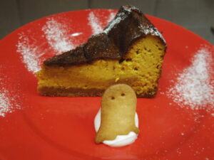 かぼちゃとキャラメルのベイクドチーズケーキ。今週からかぼちゃのお菓子が毎週登場します。おばけクッキーを添えてます。