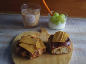 カフェで余ったチェルシーバンズと成城石井のチョコチップベルギーワッフルにブラウンチーズトッピング、シャインマスカットヨーグルト。