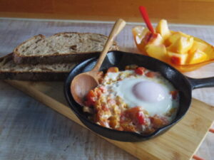 bakery ukiのカンパーニュトースト、生トマトとベーコンのシャクシュカ風、黄金桃ヨーグルト。青森の黄金桃、10月の中旬くらいまで手に入って、ホイルに包んで大事に保管して、最後まで美味しく頂きました。青森の桃も美味しかった。