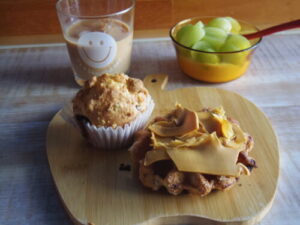 カフェで余ったマフィン、成城石井のチョコチップワッフルにブラウンチーズ乗せ、シャインマスカットヨーグルト。