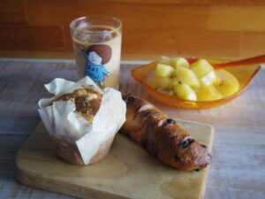 カフェで余ったマフィン、ミヤウチベーカリーのチョコチップパン、ゴールドキウイヨーグルト。