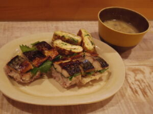 焼き鯖寿司、ネギ入り玉子焼き、みそ汁。焼き鯖寿司、集中的にたくさん作ったので、かなり掴めた感じ。新生姜の甘酢漬けも追加で作ったので、今後もちょいちょい作る予定。