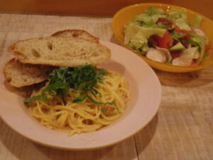 明太子スパゲティ、サラダ、カンパーニュの端っこ。カンパーニュはこの日、自作で焼いたやつ。