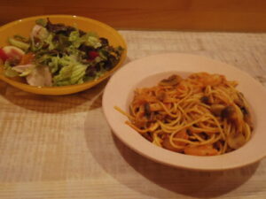 海老ときのこのトマトクリームスパゲティ、サラダ。きのこはシメジとマッシュルーム。エビは冷凍のむきエビ。
