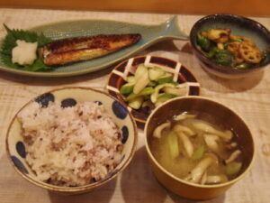 雑穀ご飯、鯖のみりん焼き、野菜の黒酢炒め、浅漬け、みそ汁。黒酢炒めの野菜はレンコン、万願寺、アスパラ、しめじ。レンコンは片栗粉をまぶしてから一旦揚げてから他の野菜と合わせると、美味しい。