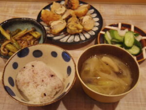 雑穀ご飯、海老しんじょの椎茸詰め天ぷら、野菜の黒酢炒め、浅漬け、みそ汁。冷凍のむきエビを細かく叩いて、卵白と片栗粉を足して、椎茸に乗せて揚げたのだけど、手間がかかる割にメイン感が薄い。