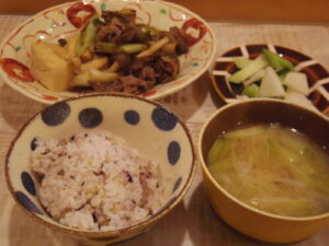雑穀ご飯、すき焼き風煮物、みそ汁、浅漬け。特売の牛コマと、ネギ、木綿豆腐、しめじを割り下でさっと煮た。冷蔵庫に木綿豆腐とネギしか無くて、冷凍の牛コマとシメジで何とかした夕飯。みそ汁もネギとシメジ。