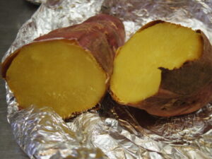焼き芋は安定のシルクスイートです。余ったら、ラムレーズンとヨーグルトでデリ風サラダにしたいなーっと、大きいやつを選んで焼き芋にしました。