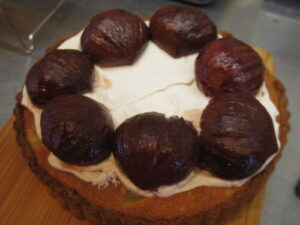 和栗のペースト入りのアーモンドクリームと和栗の甘露煮(自家製)を焼きこんだタルト台に、大きな自家製渋皮煮をどどどーっと乗せて、和栗ペースト入りの栗クリームで覆いました。
