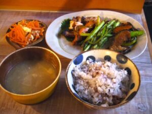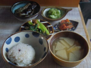 雑穀ご飯、小松菜とベーコン炒め、キュウリの酢の物、茄子とししとうの揚げ浸し、自作の色々野菜のキムチ、みそ汁。キムチはキュウリ、セロリ、大根で、楽天堂で買ったヴィーガン用のキムチキットで作ってみました。甘くなくて、ちょっと本格的な味に仕上がった。