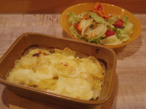 グラタンドーフィノワ、サラダ。インカの目覚めでグラタンドーフィノワ。生クリームと牛乳で煮るだけなのに美味しいー。時々無性に食べたくなるメニュー。