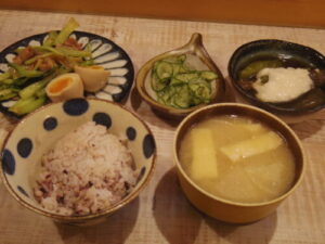 雑穀ご飯、小松菜とベーコン炒め、味玉、キュウリの酢の物、茄子とシシトウの揚げ浸しにとろろのっけ、みそ汁。