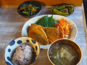 雑穀ご飯、アジフライ、人参シリシリ、しし唐と茄子とカボチャの辛みそ炒め、かぼちゃとインゲンと鶏そぼろ煮、みそ汁。