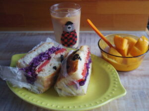 自作のオリーブフォカッチャでサンドウィッチ、黄金桃ヨーグルト。サンドの具は、紫キャベツ、ベーコン、トマト。