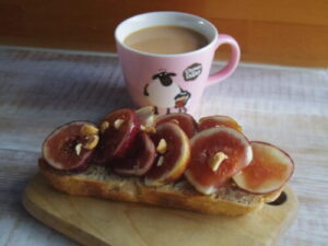 自作のカンパーニュでいちじくトースト。トーストしたカンパーニュにクリームチーズ塗って、いちじく乗せて、蜂蜜とヘーゼルナッツぱらり。