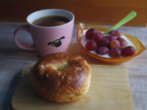 ベーグルとベイク月のメープルバターソルトベーグル、クイーンルージュとヨーグルト。