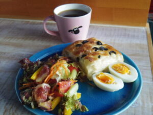 自作のオリーブフォカッチャ、サラダ、茹で卵。