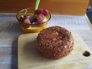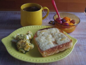 kursのパンドミでチーズトースト、ポテトサラダ、柿ぶどうヨーグルト。