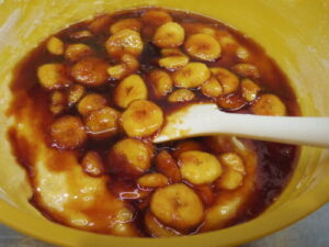 同じくテイクアウト可能なバタースコッチバナナケーキは、最初にバタースコッチバナナソテーを作ります。バタースコッチとはバター入りのキャラメルというか、まぁ昭和の人には懐かしいチェルシーとかああいうキャンディーの味です。