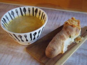 冷めたてをスープと一緒に。人参とカボチャと玉ねぎのポタージュ。パンをちょっと浸しながら食べても美味しい。スープと一緒に食べると良い感じのパン、また焼こう。