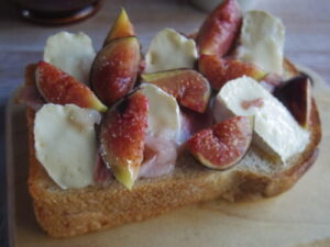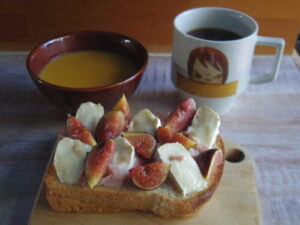 えびすやの食パンで、生ハムいちじくカマンベールトースト、人参とかぼちゃのポタージュ。