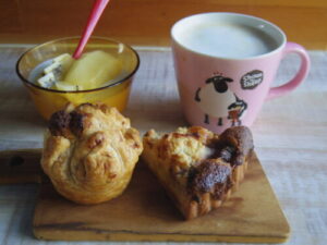 カフェで余った、パイ生地で即席パイとタルト、キウイヨーグルト。牛乳もめっちゃ余ったので、カフェラテ。パイの中は、余ったアーモンドクリームと林檎と金柑入り。