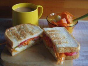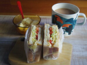 コネルヤの山食でトーストサンド、洋梨柿ヨーグルト。サンドの具は、レンチンしたキャベツ、かわきたのベーコン、キャロットラペ、トマト。