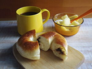 ベーグルとベイク月のチョコクリームチーズベーグル、キウイヨーグルト。クリームチーズとチョコの入ったもので、初めて買ったけど私はチョコチップだけ混ぜ込んであるやつの方が好きだった。