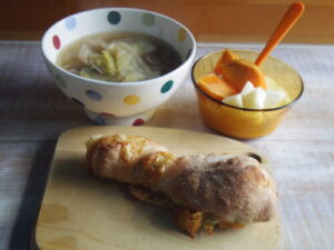 自作の枝豆チーズパン、ソーセージと野菜のスープ、柿ヨーグルト。