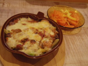 マカロニグラタン、サラダ。グラタンのベースはソーセージとマッシュルームのマスカルポーネトマトソースで、冷凍アスパラを加えてみた。