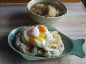 イカのづけ丼温玉乗せ、芋煮。北大路の「ちょっと丹後」という丹後のアンテナショップで、美味しいイカを手に入れたので、生姜醤油とごま油で漬け込んで丼に。めっちゃ美味しかった。芋煮の里芋もちょっと丹後で購入。