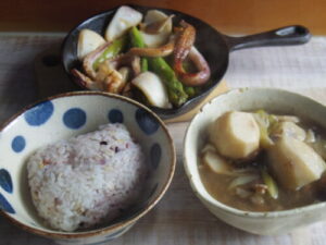雑穀ご飯、イカとアスパラのバター醤油焼き、芋煮。ちょっと丹後で買ったイカのゲソと頭部分をアスパラと焼いただけだけど、スキレットで出すと豪華に見える。