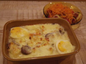 さつま芋グラタン、サラダ。グラタンは作り置きのソーセージとキャベツのスープとベシャメルを合わせたものに、皮剥いて角切りにした焼き芋と、更に茹で卵もトッピングして豪華に。冬はスープの作り置きがあると、心強い。