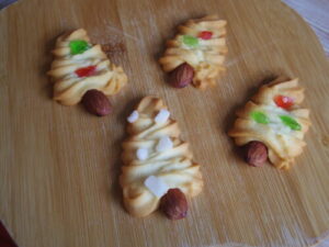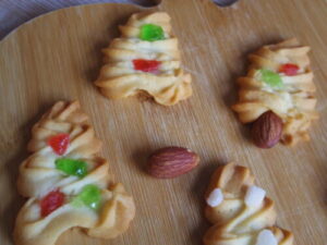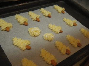 同じクッキーを大量に焼いていると、ちょっと遊び心が出てきて、試作してみたくなったので、ツリークッキーを絞りクッキーの生地でやってみた。幹はアーモンドで。