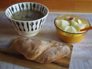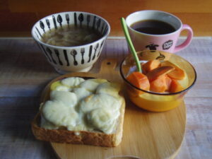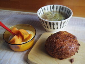 kursのパンドミで焼き芋チーズトースト、ソーセージと野菜のスープ、柿ヨーグルト。
