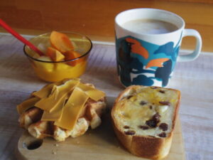 自作のレーズンブレッドトースト、成城石井のチョコチップワッフルにブラウンチーズのっけ、洋梨柿ヨーグルト。レーズンブレッドは半分はバタートースト、半分はゆずジャム塗った。