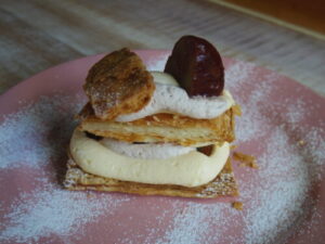 ミルフィーユはパイ(アンヴェルセ)に、カスタード、和栗クリーム、渋皮煮をサンドしてます。少しバターを入れたぽってりしたカスタードがミルフィーユに良く合います。