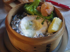 カマンベールの外側の残ったところは、カリっと焼いた自作のカンパーニュの上に乗っけて食べます。蒸籠のまま食卓に出す事は少なくて、器に移して食べる事が多いのだけど、やっぱ蒸籠のままって豪華に見えるなー。そして一人でカマンベール1個食べちゃって、いいんでしょうか、という気持ち。