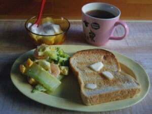 ひつじの山食でバタートースト、海老とブロッコリーと茹で卵のサラダ、ゴールドキウイヨーグルト。